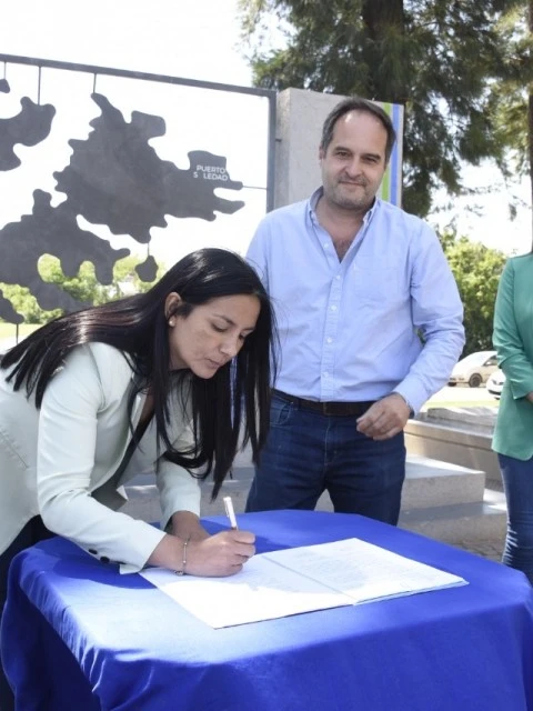 La firma del convenio para la ejecución del proyecto se realizó en las inmediaciones del Honorable Concejo Deliberante, entre Correa y Maggiotti, donde también se hizo entrega de créditos “Casa Propia-Línea Construcción”, a ocho familias de Malvinas, una posibilidad para que puedan acceder a un financiamiento a tasa cero en el camino hacia la casa propia.