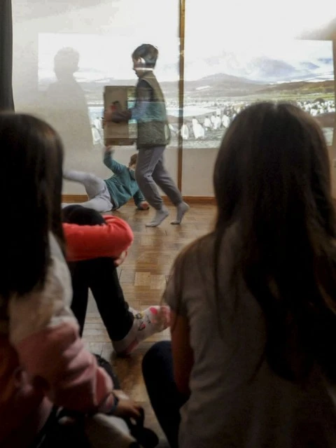 En la sala de teatro, un proyector reflejaba en la pared una foto de las Islas Malvinas y tres nenas buscaban el modo de resolver el final de una improvisación; mientras niños de otro curso bajaban las escaleras mostrando los "susurradores" que hicieron y decoraron con tubos para contarse al oído -y en voz muy baja- poemas, leyendas y cuentos.