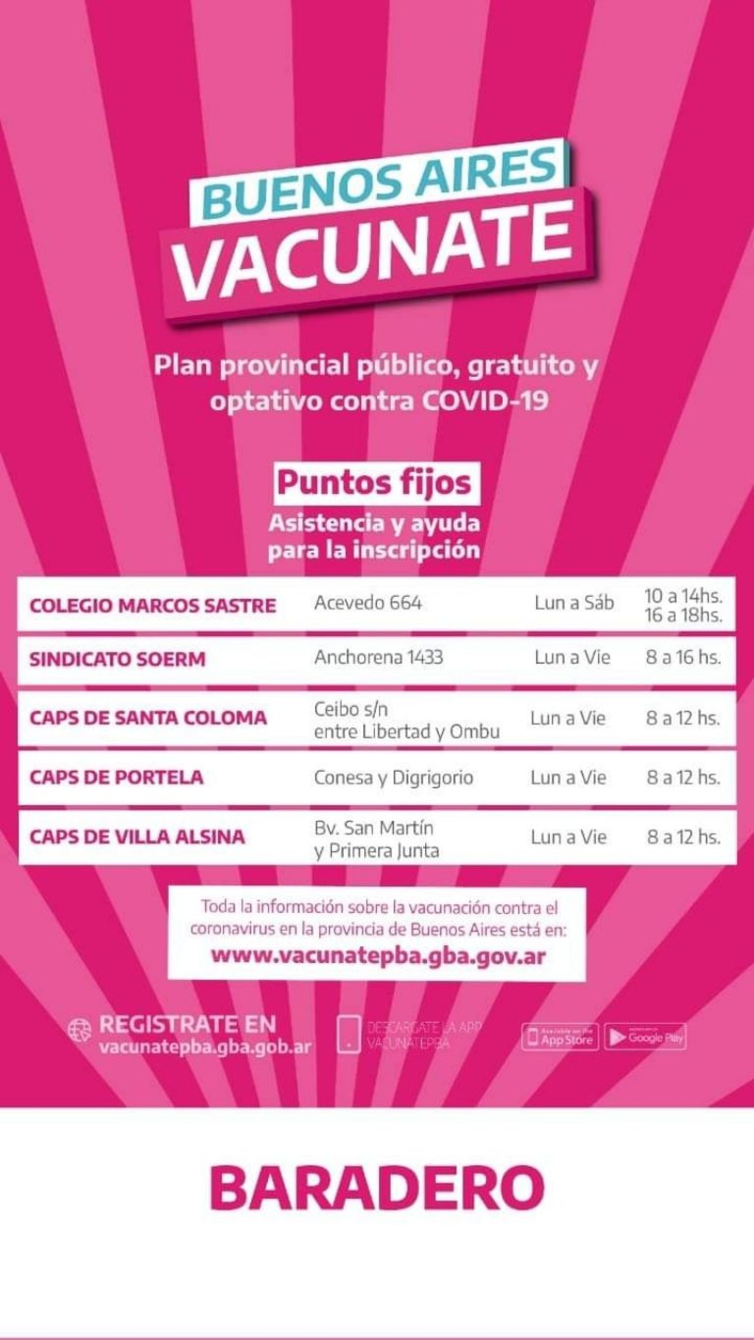 El arribo de las vacunas permitirá continuar durante la semana con el cronograma previsto en el Plan Provincial de Vacunación con los turnos que se otorgan a través del sistema. Quieres quieran recibir la vacuna gratuita, pública y optativa contra el Covid-19 deben inscribirse a https://vacunatepba.gba.gob.ar/ o acercarse a los siguientes Puntos Fijos: