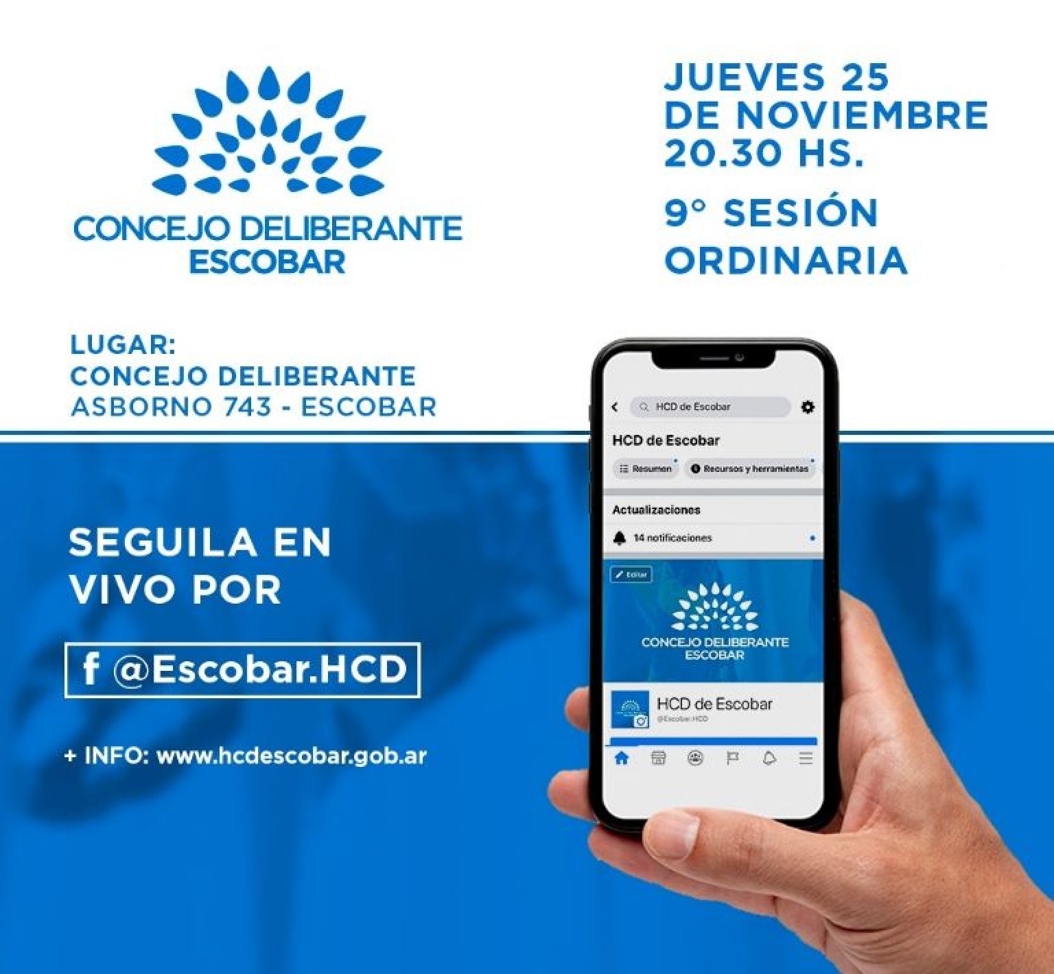 El Concejo Deliberante llevará a cabo la Novena Sesión Ordinaria el jueves 25 de noviembre, a las 20:30 horas, en el recinto sito en la calle Asborno 743 de la ciudad de Belén de Escobar.