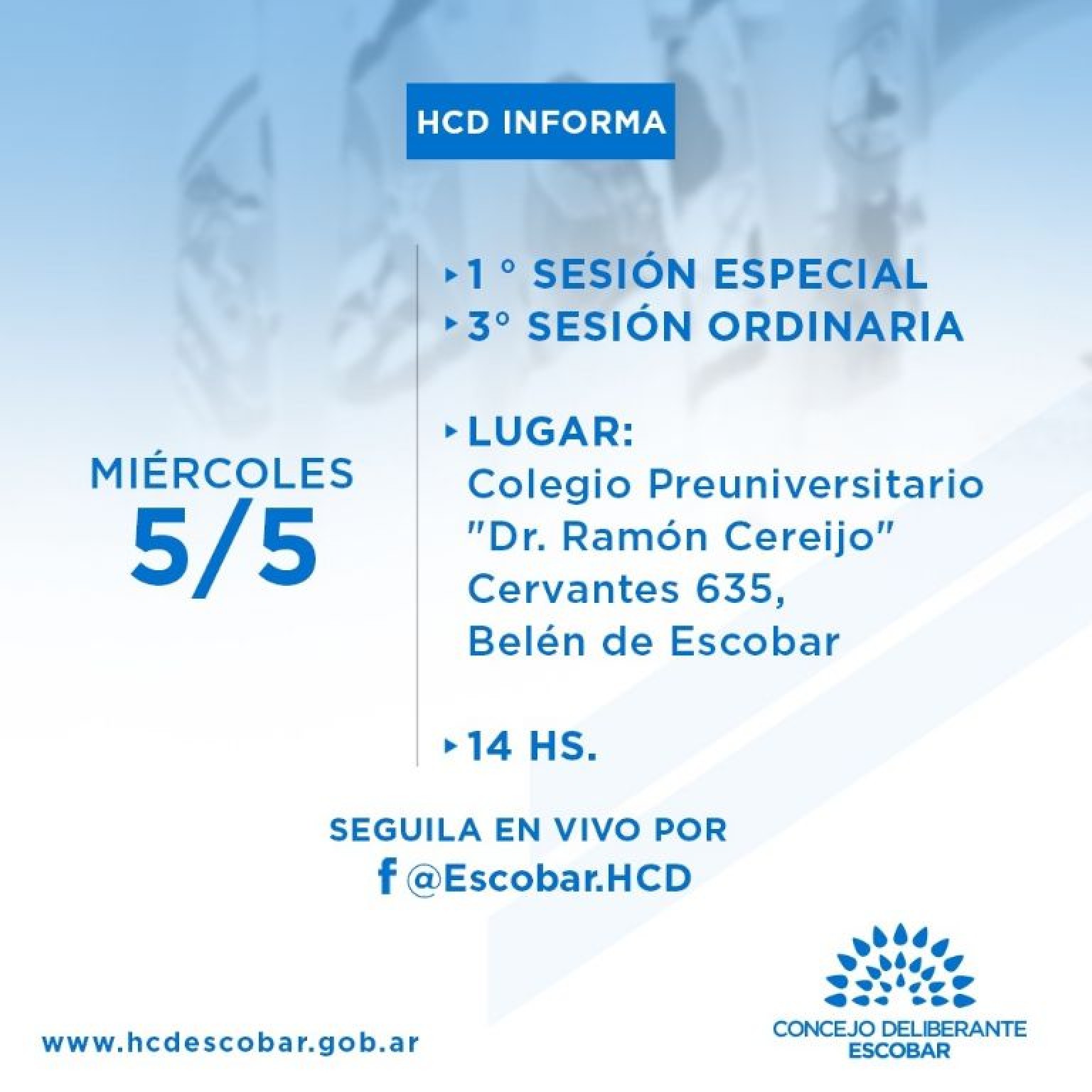 El Concejo Deliberante de Escobar sesionará el día miércoles 5 de mayo, a las 14 horas, en el Colegio Preuniversitario “Dr. Ramón Cereijo”, sito en la calle Cervantes 635 de la ciudad de Belén de Escobar, con estrictas medidas de bioseguridad, cumpliendo las normativas de prevención ante la pandemia de COVID-19.