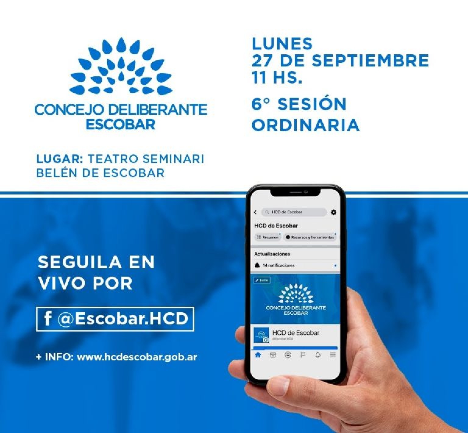 Los vecinos y las vecinas podrán seguir la sesión a través de la transmisión en vivo que realizará el Concejo Deliberante desde su red oficial de Facebook: https://www.facebook.com/Escobar.HCD.