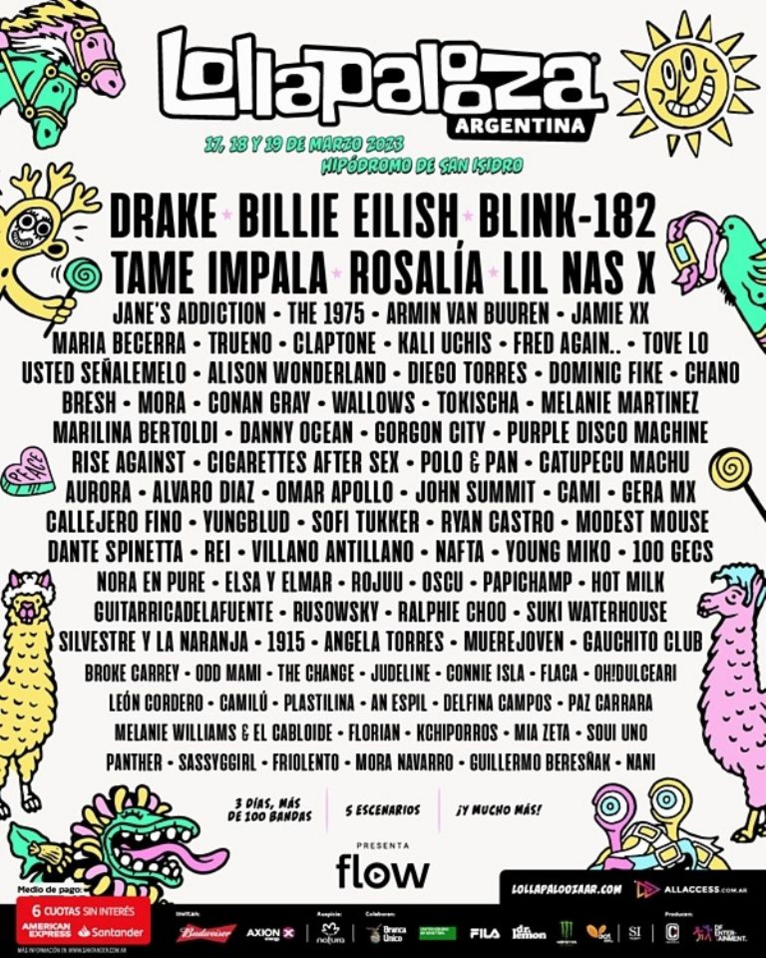 Los largamente esperados debuts en nuestro país de la británica Billie Eilish y el grupo de punk pop Blink-182, el regreso de Rosalía luego de su aclamado show de agosto pasado en el Movistar Arena, la llegada del rapero canadiense Drake y la presencia de los neopsicodélicos australianos Tame Impale serán algunas de las atracciones de la 8va. edición de Lollapalooza Argentina, que se realizará el 17, 18 y 19 de marzo, en su tradicional escenario del Hipódromo de San Isidro.