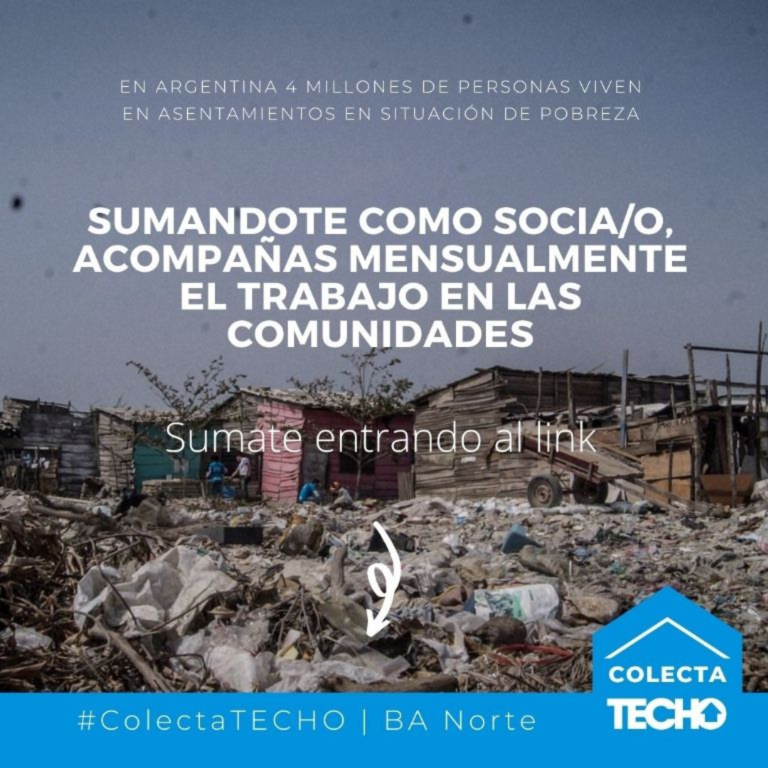 TECHO es una organización de la sociedad civil que busca superar la pobreza en los asentamientos, a través de la acción conjunta entre voluntarios/as y vecinos/as. Cuenta con oficinas en Buenos Aires, Córdoba, Santa Fe, Corrientes, Chaco, Tucumán, Neuquén, Río Negro, Salta y Misiones.